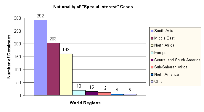 Following the attacks of September 11, the Department of Justice launched an extensive effort aimed at "apprehending those responsible for the September 11 attacks and ...detecting, disrupting, and dismantling terrorist organizations."6 Thousands of Federal Bureau of Investigation (FBI) agents, working with other federal, state and local agencies, have been conducting an unprecedented investigation into terrorist activities in the U.S. Determined to move swiftly given the urgency of the situation and public pressure to show results, the Department of Justice began a process of questioning thousands of people about whom there were "indications" they might have information about or links to terrorist activity.7 Our research suggests that the "indications" that triggered questioning in many cases may have been little more than nationality, religion, and gender.8 As of July 2002, the September 11 investigation had not yielded any criminal indictments for crimes connected to terrorist activity.9 Some 1,200 Muslim non-citizens questioned by federal agents in connection with the September 11 investigation were subsequently taken into custody. The vast majority was arrested by the Immigration and Naturalization Service (INS) for immigration law violations, e.g. working on a tourist visa, that had nothing to do with terrorism. Prior to September 11, such violations would not have warranted continued detention; persons arrested would have been quickly released on bail pending final decision on deportation. But immigration violations were the only possible legal basis (other than material witness warrants) for detaining persons identified as of interest to the September 11 investigation while the Department of Justice continued investigating whether they had information about or links to terrorist organizations. The criminal law in the U.S. rightfully does not permit preventive detentions for investigative purposes.10 The Department of Justice turned to the immigration law system to conduct what has been called a "campaign of mass preventive detention."11 Almost all of the post-September 11 immigration detainees-whom the government has called "special interest" detainees-were ultimately deported or released on bond-sometimes after months of detention-after the Department of Justice concluded they had no connection to terrorist activities or groups. Almost all of the "special interest" detainees whose nationalities were revealed by the Department of Justice on January 11, 2002 came from countries in South Asia, the Middle East, and North Africa, as shown on the graph below. The largest group of detainees (248) was from Pakistan, followed by Egypt, 100, and Turkey, fifty-two. Some of the nationals of countries in North America and Europe who were classified as "special interest" cases were naturalized citizens and were in fact also born in South Asia, the Middle East, and North Africa. The Department of Justice has not released the nationalities of post-September 11 detainees charged with federal or state crimes or held on material witness warrants and they are therefore not included in the graph below.