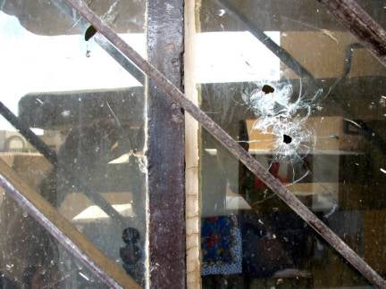 Bullet holes behind the steps where Muhammad Subhi Hassanal-Qubaisy was killed. September 23, 2003. © 2003 Fred Abrahams/Human Rights Watch