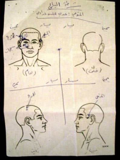 Autopsy report showing wounds on `Uday `Abbas `Aday, an Iraqi guard mistakenly killed by soldiers from the 82nd Airborne in Baghdad on July 10. © 2003 Fred Abrahams/Human Rights Watch