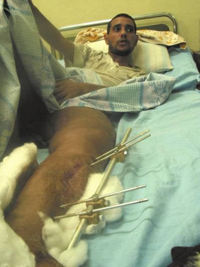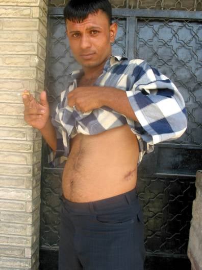 Haidar Hussain Karim al-Fatlawi was shot in the leg by U.S.soldiers on Haifa Street, after they were attacked by a grenade or roadside bomb. September 28, 2003. © 2003 Fred Abrahams/Human Rights Watch