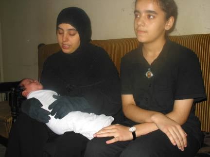 Anwar Kadhim Jawad with her infant son Hassan and daughter Hadil `Adel `Abd al-Karim al-Kawwaz, 12. Anwar's husband and three children were killed on August 7 by U.S.troops when their car failed to stop at a poorly marked militarycheckpoint. She gave birth to Hassan one week later. September 26, 2003. © 2003 Fred Abrahams/Human Rights Watch