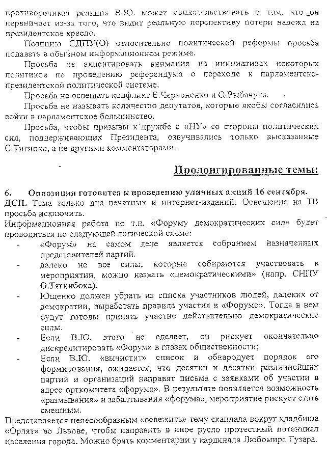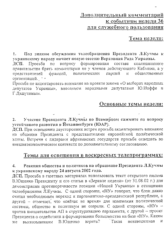 FIU. A request for newspaper materials to use the text of V. Yushchenko's open letter to the president and his article in "The Mirror Weekly" (from August 31, 2002) to demonstrate the contradictory position of "Our Ukraine" in relation to L. Kuchma's television address. On the one hand, "OU" says that its bloc has considered a transformation to a parliamentary-presidential republic to be necessary, and on the other hand notices that "now is not the time" for a change of political systems; society and politicins [sic] aren't ready. On the one hand, "OU" is against the interference of the PA [Translator's note: Presidential Administration] in the structuring of parliament, and on the other hand, requests the president's cooperation in forming a majority around "OU." Which of the pronouncements of V. Yushchenko are we to believe? These unbalanced and contradictory reactions of V.Yu. may provide evidence that he is nervous and recognizes the possibility that his hopes for the presidential seat are lost.