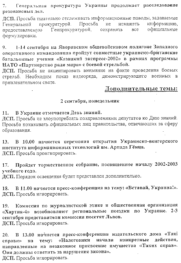 20. A press conference held by the publishing house "Taki spravi" will begin at 13.00 on the theme: "The tax police began concrete actions directed towards the illegal seizure of `Taki spravi' property. They should answer for their violations of the law."