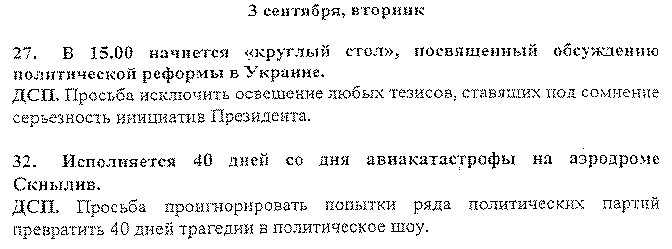 1. Начать выпуски с сообщения о том, что в данный момент проходит концерт-реквием памяти жертв трагедии 11 сентября 2001 года. На мероприятии присутствует Президент Л.Кучма.