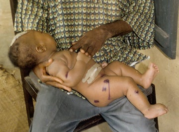 A three-month-old baby injured in an attack by PDP supporters on the house of Olusegun Mbadiwe Ibiam, a man believed to be sympathetic to the ANPP, on May 4, 2003. Uwanna, Afikpo North, Ebonyi State.