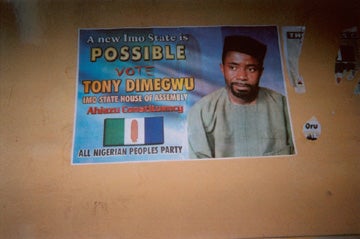 Election poster for Tony Dimegwu, ANPP candidate for Imo State House of Assembly. Dimegwu was attacked and injured by PDP supporters on April 19, 2003.