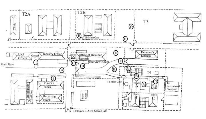 <<previous | index | next>> IV. Physical Abuse and Ill-Treatment of ISA Detainees in Kamunting Detention CenterThe Malaysian government continues to bar international and Malaysian human rights groups from visiting Kamunting. Consequently, descriptions about conditions in Kamunting come from detainees, their families, detainees lawyers, who have limited physical access to the facility, and the Human Rights Commission of Malaysia, SUHAKAM. According to the 2003 Suhakam report on conditions of detention under the ISA, most ISA detainees in Kamunting live in dormitory style blocks, which are surrounded by a grassy compound. The detainees are allowed to move within designated areas of the compound. 25 Detainees accused of similar offenses are housed together. Each cell block is numbered. In 2003, detainees were allowed restricted access to newspapers and books.26 They were allowed one visit a week from relatives lasting no more than thirty minutes and with no more than two persons at a time. The visiting rooms were divided with wire mesh barriers separating the detainee and the visitor. Visitors were allowed to bring in only fruit for the detainees and a certain number of books per visit.27 Suhakam recommended amendment of the rules to enable detainees to spend more time with their families.28 Suhakam recommended that detainees should not be physically separated from their families by a wire mesh barrier and that prison officials need not be present during family visits because ISA rules permit authorities to search visitors.29 In mid-2004, amid increased scrutiny of the treatment of ISA detainees in Police Remand Centers and growing pressure from detainees and their families, conditions in Kamunting were relaxed. Detainees cell blocks, which normally were open from 7:00 a.m. to 7:00 p.m., would instead close at 10:00 p.m.30 Detainees could visit different cell blocks.31 Wire mesh partitions in visiting rooms were removed and detainees and their families were allowed physical contact and to visit for more than an hour. Families were also permitted to bring food for their husbands on special occasions. Detainees were also allowed to make handicrafts, which their families sold to the public.32 In early December 2004, a new director, Yasuhimi bin Yusoff, was appointed at Kamunting. According to detainees families, the new director began to limit the detainees new privileges, which had been negotiated with the previous director. Human Rights Watch recognizes that the inspection of detainee cells and the maintenance of security are legitimate procedures in any detention facility. The December 2004 Incident at KamuntingThe events of December 8 and 9 involved detainees in cell blocks T2B and T4, which house detainees alleged to be members of Jemmah Islamiyah. (See the following page for a drawing of the facility by an ISA detainee at Kamunting Detention Center; the drawing identifies the location of cell blocks T1, T2, T3, and T4, and marks the locations of events on December 8 and 9, 2004. The map was re-drawn by Human Rights Watch for the purposes of formatting and translation. A copy of the original map in Malay is at Appendix A). Drawing of Kamunting Detention Center by ISA Detainee Identifying Location of Events (A-O) on December 8 and 9, 2004 (English Translation)