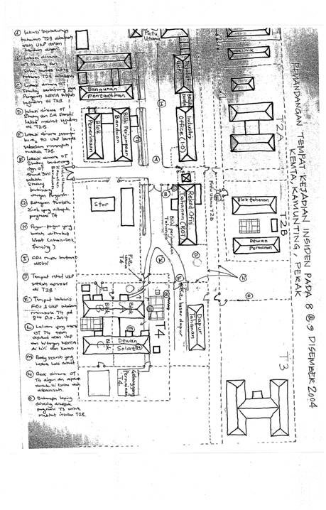 Copy of original drawing of Kamunting Detention Center by an ISA Detainee identifying location of events (A-O) on December 8 and 9, 2004.