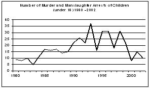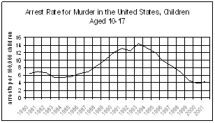 Today, few children in Colorado who have committed serious crimes appear in juvenile courts. Gus Sandstrom, a prosecutor in Colorado, acknowledged to Human Rights Watch that prosecutors prefer to charge children accused of serious crimes directly in adult courts rather than beginning in juvenile court and having a transfer hearing. Douglas Wilson, a public defense attorney told Human Rights Watch that since 1992, his public defenders office in Pueblo, Colorado has not represented a single child offender at a transfer hearing. He explained that he has talked with public defenders throughout the state and has found no one who has represented a child at a transfer hearing over the past ten years. According to Wilson, its almost as if it is considered prosecutorial misconduct to [begin in juvenile court and] do a transfer hearing in these cases. Instead, [prosecutors] just file [charges against children] directly in adult court.12 While Wilson acknowledged it was possible that there were cases in which a private attorney handled a transfer hearing in juvenile court, he pointed out that the prosecutions burden is much heavier going through a transfer hearing, so why would they do it?13 When charges are filed against children directly in adult courts, there is no hearing to determine whether the child should be in juvenile court. Indeed, judges in adult courts have no authority to withdraw their jurisdiction and send a child charged with a serious crime as an adult back to juvenile court.14 Prosecutors can, of course, consider the pros and cons of charging a child in adult court. Indeed, Gus Sandstrom stated that each district attorneys office in the state has its own internal evaluation process to determine whether or not to directly file a case in adult court.15 But prosecutorial discretion cannot substitute for a full adversarial hearing before a judge. No law requires prosecutors to consider all the factors that juvenile courts must before transferring a child, nor are they required to provide any written explanation of their decision. Our research suggests that prosecutors decisions to file in adult court depend almost entirely on the nature of the crime coupled with the extent of news coverage and public outrage. There is little indication they weigh carefully such factors as a childs potential for rehabilitation, mitigating circumstances, or the childs competency to stand trial as an adult. All defendants in the United States have a right to due process of the law, which requires that they are competent to stand trial.16 They must be able to understand the charges against them; have a basic understanding of the roles of their own and opposing attorneys and the functions of judge and jury; be able to consult with their attorney in a meaningful way; and be able to weigh the consequences of the decisions they have to make, such as whether or not to accept a plea.17 Young adolescents, however, may be ill-equipped to handle trial in adult court. In fact, it was partly childrens poor capacity for adult criminal trials that provided the impetus for the juvenile court system in the United States. Juvenile courts are responsible for adjudicating cases against children based on their status as children (i.e., for violations of laws that are applicable only to children such as running away from home), and delinquency cases against children (i.e., for acts committed by children which would result in criminal prosecution if committed by an adult). The separate juvenile court system in the United States is based on the premise that children are different from adults and as a result are more amenable to treatment and rehabilitation. Juvenile courts seek to focus on each individual child and take into account his or her particular problems and needs while devising a treatment plan that will help the child to change and minimize the potential for future criminal behavior. Since 1997, the MacArthur Foundation Research Network on Adolescent Development and Juvenile Justice, whose members include leading legal and scientific professionals as well as academic experts, has been conducting a study of the competency of children to stand trial in adult court. The study has examined a broad range of factors, including childrens understanding of basic elements of the judicial process and their rights as defendants; their ability to put facts together and draw logical conclusions; and their ability to make decisions independent of pressure from authority figures. The research indicates that many young adolescents, particularly those fifteen and under, are not developmentally mature enough to be competent. They are seriously disadvantaged by virtue of their age to stand trial in adult courts and to be subject to all the rules, procedures, and consequences of such trials.18 Juvenile Crime RatesThe United States experienced a sudden and troubling increase in violent crime by children and adolescents that began in the mid-1980s and continued until the mid-1990s.19 While a number of factors fueled this increase, experts point particularly to the active recruiting of children into armed drug-dealing gangs, although changes in the way crimes were recorded in the 1990s also contributed to the rising numbers.20 Between 1985 and 1994, murders committed by children with guns more than tripled.21 Figure 1 shows the national arrest rate for children charged with murder.22 Colorados experience closely followed this national pattern, with violent juvenile crime rising dramatically from the mid 1980s until the mid 1990s, as revealed in Figure 2. During the Summer of Violence in 1993, the state was consumed by a dramatic spate of killing by youths in affluent, white areas and previously crime-free parks. 23 Press stories described child offenders as kid gangsters, hard-core juvenile offenders, scary and dangerous youths, young thugs preying on their fellow citizens, the states nastiest young felons, kids doing the criminal work of