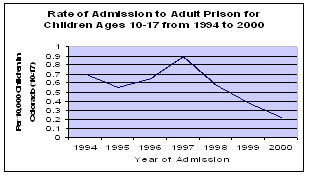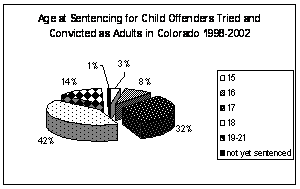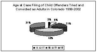 Source: SB94 N-Trails Report, Fiscal Year 1999-2000, Omni Institute, April 2001 (report prepared for the Colorado legislature on the implementation of Senate Bill 94). [3] Milan Simonich, 1899 Show Me State Showed Off Missouri to the Nation, Pittsburgh Post-Gazette, May 3, 1999. [4]See Briones v. Juvenile Court for Denver, 188 Colo. 189 (S. Ct. Colo. 1975). [5] See Colorado Childrens Code, Colo. Rev. Stat. § 19-3-106(4)(b) and § 19-3-108 (1973). Prior to the passage of this law, and at least by 1967, children above the age of sixteen accused of crimes of violence punishable by death or life imprisonment could be transferred from the juvenile system to the adult district court. See Colorado Childrens Code, Colo. Rev. Stat. § 22-1-4(b) (effective date July 1, 1967). [6]People v. Moseley, 193 Colo. 256, 259 (1977). See also Colo. Rev. Stat. § 19-2-518 (1) (a) (II). [7] Colo. Rev. Stat. § 19-1-104(4)(b). [8] Colo. Rev. Stat. § 19-2-517(1)(a). [9]The additional categories of children who may be charged directly in adult court include: a child aged fourteen or older who is alleged to have committed a felony offense described in part 1 of article 12 of Colo. Rev. Stat. § 18 (other than possession of a handgun); or who is alleged to have committed vehicular homicide, vehicular assault, or felonious arson; or is alleged to have committed a delinquent felony act and has previously been tried in adult court either directly or via transfer (unless he is found not guilty of the prior offense); or is alleged to have committed a delinquent felony act and is determined to be a habitual juvenile offender (a repeat offender). Or, a child aged sixteen or older who has been adjudicated delinquent for a felony act and is alleged to have committed a class three felony (with some exceptions). [10]Murder in the first degree (including felony murder, murder of a peace officer or fireman, and extreme indifference murder) is a class one felony. An individual convicted of a class one felony in Colorado faces mandatory sentences of either the death penalty or life without parole. In Colorado, the death penalty may not be imposed on children. See Colo. Rev. Stat. § 18-1.3-1201(1)(a). [11]Human Rights Watch telephone interview with Tamara Brady, Esq., Colorado, April 2004. [12]Human Rights Watch telephone interview with Douglas Wilson, Esq., Colorado, September 9, 2004. [13]Human Rights Watch telephone interview with Douglas Wilson, Esq., Colorado, January 4, 2005. [14]See Colo. Rev. Stat. § 19-2.518 (1)(d)(III). [15]Human Rights Watch telephone interview with Gus Sandstrom, Esq., Colorado, September 16, 2004. Mr. Sandstrom explained that factors such as whether the defendant acted out of pure immaturity or with culpable intent are considered, as well as whether the offense is the defendants first, or whether the child has been involved in multiple crimes or gang behavior, like someone who has been prosecuted in the past for multiple drive-by shootings. [16] See Kent v. United States, 383 U.S. 541, 557 (1966) (right to full, adversary-style representation in juvenile transfer proceedings); In re Gault, 387 U.S. 1, 3 (1967) (ruling that the constitutional protections afforded to adults must also be afforded to juveniles during delinquency proceedings). [17] Dusky v. United States, 362 U.S. 402 (1960). [18]Thomas Grisso, Laurence Steinberg, Jennifer Woolard, Elizabeth Cauffman, Elizabeth Scott, Sandra Graham, Fran Lexcen, N. Dickon Reppucci, Robert Schwartz, Juveniles Competence to Stand Trial, Law and Human Behavior, vol. 27 (2003). [19] The National Center for Juvenile Justice, Juvenile Arrest Rates by Offense, Sex, and Race (1980-2002), August 1, 2004, available online at: http://ojjdp.ncjrs.org/ojstatbb/crime/excel/JAR_20040801.xls, accessed on February 1, 2005. [20]See Alfred Blumstein and Richard Rosenfeld, Assessing Recent Ups and Downs in U.S. Homicide Rates, The National Consortium on Violence Research, 1998. [21] Malcolm Young and Jenni Gainsborough, Prosecuting Juveniles in Adult Court, The Sentencing Project, January 2000, available online at: http://www.soros.org/initiatives/justice/articles_publications/publications/juvenilesasadults_20020101/juvenilesadultcourt.pdf, accessed on February 1, 2005. [22] Figures 1 through 6 appear at the end of Section III. [23] Two of the most widely reported crimes during the summer involved Lori Ann Rowe, an elementary school teacher, who was murdered allegedly by a sixteen-year-old in a suburban parking lot; and six-year-old Broderick Bell, who was shot in the head, allegedly by a teenage girl in a gang-related drive-by shooting. Bell survived, but with lasting mental and physical disabilities. [24]Paul Colomy and Laura Greiner, Making Youth Violence Visible: The News Media and the Summer of Violence, Denver University Law Review, Vol. 77, p. 661, 2000. [25] The National Center for Juvenile Justice, Juvenile Arrest Rates by Offense, Sex, and Race (1980-2002), August 1, 2004, available online at: http://ojjdp.ncjrs.org/ojstatbb/crime/excel/JAR_20040801.xls, accessed on February 1, 2005. [26] Figures 1 and 2 are based on data obtained from the National Center for Juvenile Justice, Juvenile Arrest Rates by Offense, Sex, and Race (1980-2001), May 31, 2003 (developed for the Office of Juvenile Justice and Delinquency Prevention, based on unpublished data from the Federal Bureau of Investigation and from the FBIs Crime in the United States Reports, Population Data from the U.S. Census). [27] Jessica Zender, Policy Analyst, Planning and Analysis, Colorado Office of the State Court Administrator, November 5, 2004 (data on file with Human Rights Watch). [28]U.S. Department of Justice, Bureau of Justice Statistics, Crime and Justice in the United States and in England and Wales, 1981-96, October 1998, available online at: http://www.ojp.usdoj.gov/bjs/pub/pdf/cjusew96.pdf, accessed on February 1, 2005. [29]Steven Levitt, Juvenile Crime and Punishment, Journal of Political E