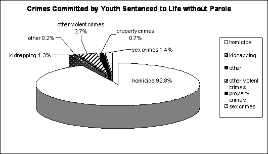 Source: Data provided from thirty-eight state correctional departments and additional other sources for the states of Alabama and Virginia. Life without parole is imposed for a variety of crimes, as shown in Table 3.46 However, it is most often imposed on child offenders who have been convicted of crimes of homicide, as shown in Figure 2. Table 3: Crime Categories