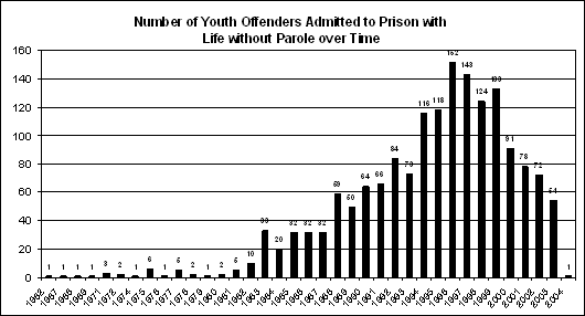 T. was age thirteen in this photo and committed his crime at age fourteen. Stacey T. was about to enter the tenth grade at a Pennsylvania high school, under a magnet program for students who excelled in school, at the time of his crime. He lived at home with his mother, a single parent. When Stacey T. was fourteen years old, he was arrested for the murder of Alexander Porter, a young man who was his girlfriends brother. Stacey was convicted of second-degree murder (felony murder in Pennsylvania) and sentenced to life without parole. He had no juvenile record, and this crime was his first. Stacey was charged directly in adult court; he never had a juvenile transfer hearing. Court documents and an interview with Staceys attorney for this report indicate that Stacey T. agreed to participate with two adults (Henry Daniels, who was Staceys cousin, and Kevin Pelzer) in a robbery of Alexander Porter, who was assumed to be wealthy, because it was common knowledge that his family was involved in drug dealing. 56 The plan involved coercing Porter to give over the keys to his apartment so that the two adults (Daniels and Pelzer) could rob it. The courts decision in the case of Staceys cousin establishes that the three perpetrators: [S]et up a purported drug transaction with Porter, in order to lure him to a meeting, whereupon they bound and gagged him, confiscated his keys, and stuffed him in the trunk of his car. One of the conspirators [Stacey], a friend of Porters, allowed himself to be tied up in front of Porter. . . . He was released after Porter was locked in the trunk, then taken home so that Porter would later believe that he had been murdered. The remaining conspirators drove Porters car, with Porter in the trunk, to the garage of one of the individuals and parked it there.57 Stacey explained that Daniels and Pelzer pretended to murder him in order to coerce Porter to give over the keys or face the same fate. In Pelzers appeal, the court described what Pelzer and Daniels did in the twenty-four hours after Stacey left the scene: Twice during the next twenty-four hours while Porter was kept in the car trunk, the kidnappers used Porter's car on excursions. . . . First, they used the vehicle to get to Porter's parents' apartment to commit burglaries. . . . [Pelzer] and Daniels went home, slept for a few hours, then took Porter to a park, shot him four times in the neck and back with a .25 caliber handgun, and left him by the roadside where his body was discovered the following day. . . . While Porter was being bound, [Stacey] was led outside, supposedly to be punished, but actually to be released.58 [According to Pelzer] [M]e and [Daniels] got into the boy's car, the black shiny one to drive [Stacey] home. I drove the car. We dropped [Stacey] off and returned to my house.59 In short, while Stacey T. had agreed to participate in a robbery scheme, he was not present for the murder of Porter, nor was there evidence presented at trial that suggested he knew Daniels and Pelzer were going to murder Porter. Indeed, it would appear that the murder itself was never planned as part of the scheme. Stacey was convicted of second degree murderPennsylvanias equivalent of a felony murder conviction in other states, and which has put him behind bars for the rest of his life. Stacey wrote: Convinced that I could make some money, I agreed with my cousin to rob this guy of his keys so that [my cousin] and his friend could rob the guys and his fathers apartment. . . . but I had no idea that this guy would end up dead. . . . Yes, I made a mistake. I associated with the wrong crowd. I engaged in committing a crime with them. However, is it fair that I spend the rest of my life in prison for a crime which was committed by someone else without my knowledge or without me being present? I feel sorry for the life which was lost in my case. I feel a deep sense of empathy for his family and what they must continue to endure in terms of pain. But this tragedy was never supposed to happen. I dont absolve myself of all guilt. I, out of naiveness, out of influence, out of the ignorance of knowing the consequences, agreed to do a crime: a robbery.60 Historical Trends in Sentencing to Life without ParoleAs shown in Figure 3, from 1962 until 1981, an average of two youth offenders in the United States entered prison each year with life without parole sentences. Beginning in 1982, the number began to rise markedly, peaking at 152 youth in 1996. Although the number has declined since 1996, it has never returned to the much lower figures from the 1960s to mid-1980s. While the absolute number of youth sentenced to life without parole has decreasedsince 1996, the nationwide proportion of youth sentenced to life without parole for murder has increased relative to the total number of youth arrested for or reliably implicated in murders nationwide (known murder offenders).61 Figure 3