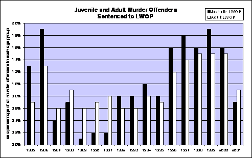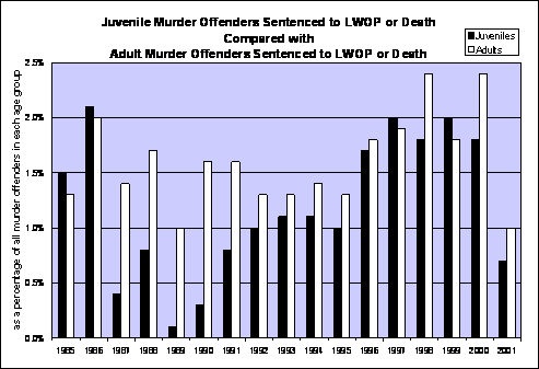 Source: H. Snyder, T. Finnegan, Y. Wan, and W. Kang, "Easy Access to the FBI's Supplementary Homicide Reports: 1980 2000," 2002, available online at: http://ojjdp.ncjrs.org/ojstatbb/ezashr/ , accessed on September 14, 2005 (using data from the Federal Bureau of Investigation, Supplementary Homicide Reports 1980-2000 [machine-readable data files]). Data on dates of entry to prison contained in data provided by thirty-eight state correctional departments and additional other sources for the states of Alabama and Virginia. Comparing the imposition of life without parole sentences on children and adults convicted of murder casts additional light on the increasing punitiveness toward child offenders. As shown in Figure 4, in eleven out of the seventeen years between 1985 and 2001, youth convicted of murder were more likely to enter prison with a life without parole sentence than adult murder offenders.62 Even when death sentences are included, as shown in Figure 5, in one quarter of the same seventeen years, child murder offenders were more likely to receive either the death penalty or life without parole than adults. In the remaining years, adults were only slightly more likely to enter prison with either life without parole or death sentences (between 1.3 and 0.1 percentage points)a remarkable finding given that during most of the years studied, large numbers of states had abolished the juvenile death penalty. On its face, this data suggests that states have often been more punitive towards children who commit murder than adults. At the very least, it suggests age has not been much of a mitigating factor in the sentencing of youth convicted of murder. Figure 4