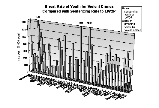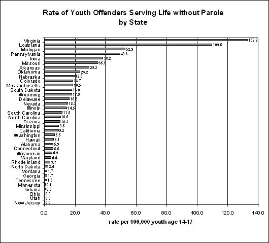 Source: Data provided by thirty-eight state correctional departments and additional other sources for the states of Alabama and Virginia. In Figure 6, below, we present the rates at which states impose the sentence relative to state youth populations. The range in the rates is extraordinary: Virginia has the highest rate, 132.90 per 100,000 youth age fourteen to seventeen, a rate that is 886 times larger than Ohios lowest rate of 0.15. The national rate is 14.20. Figure 6