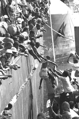 Thousands of frightened Liberians struggle to board a ship in the Freeport of Monrovia in May 1996 to escape heavy fighting between forces from the NPFL and ULIMO-K. The fighting from April May 1996 resulted in heavy civilian casualties. © 1996 Corinne Dufka Massive looting also took place when the RUF and Liberian government troops attacked Guinea in 2000. An operational commander with the Liberian Jungle-Fire militias explained: The SOP [Standard Operations Procedure] of that operation was not to loot, but to destroy. However, people had to loot because that was the only way we were paid. My boys who went on the operation brought me a car engine, freezer, video, tapes, clothes, jeans, boots, and money. The code-name of this operation was Laspan.75 [58] See, Sowing Terror: Atrocities against Civilians in