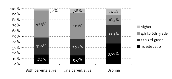 The data suggest that orphans are on average less educated than those with one or two parents. Over 70 percent of the orphans had only completed third grade or lower, compared to less than 50 percent among children with one or both parents alive. |