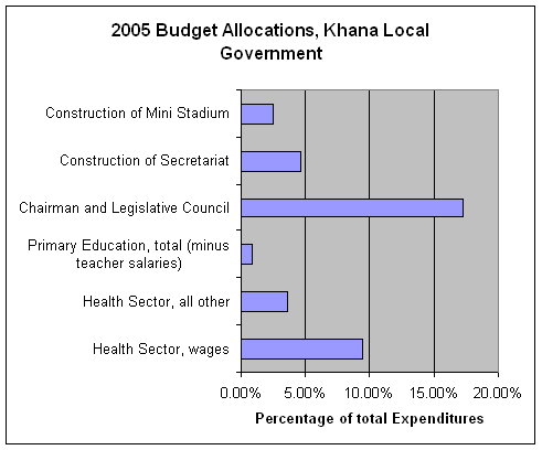 The demonstration fish farm at Bori. © 2006 Chris Albin-Lackey/Human Rights Watch The School for the Physically Challenged was commissioned only in late 2005 but nearby residents said that it had never opened its doors to any students and had no staff.205 It was accessible from the adjacent road only by leaping across a steep and muddy ditch. The structure itself was already suffering from disuse; several of its windows were broken, and weeds had sprouted up through some of the classrooms concrete floors. The local government also allocated N29 million ($223,000) for the construction of a mini stadium in 2005.206 This stadium also reportedly does not exist, and it is not clear what became of the funds that were meant to be used for its construction. Little Left Over for Health Care and EducationBetween the phantom projects and the enormous allocations to the chairman and his council, little was left over for health care and education (see table 3). According to local officials, teachers and health workers, however, even the inadequate funds set aside for those two sectors were largely squandered. Table 3: 2005 Budget Allocations, Khana LGA207 Primary EducationKhana set aside only N750,000 ($5,770) to cover the overhead expenses of all of the local governments 112 public primary schools in 2005: roughly N6,700 ($51) per school.208 The budget also called for N10 million ($77,000) to be spent on the renovation and furnishing of primary schools.209 The Secretary of the Local Government Education Authority, however, told Human Rights Watch that no schools had been renovated in either 2005 or 2006. He attributed this failure to the people who are causing trouble for the chairman.210 Asked whether any of the LGAs primary schools had pit latrines or supplies of water, the LGEA Secretary replied, You should begin by asking whether they even have classroom facilities, not to speak of toilets and water! How can you have toilet facilities when you do not even have classrooms? Asked about the availability of textbooks, he said, There is nothing like that.211 The LGEA Secretary nonetheless defended the chairmans record, stating that he honestly believed that the man is trying.212 The teachers in the several primary schools visited by Human Rights Watch felt differently, however.213 The headmaster of one remote communitys school complained that the local government doesnt provide anything for us. He claimed that since 2004 the LGC had even stopped providing the school with chalk and said that in a meeting he had attended along with staff from other schools in 2005: