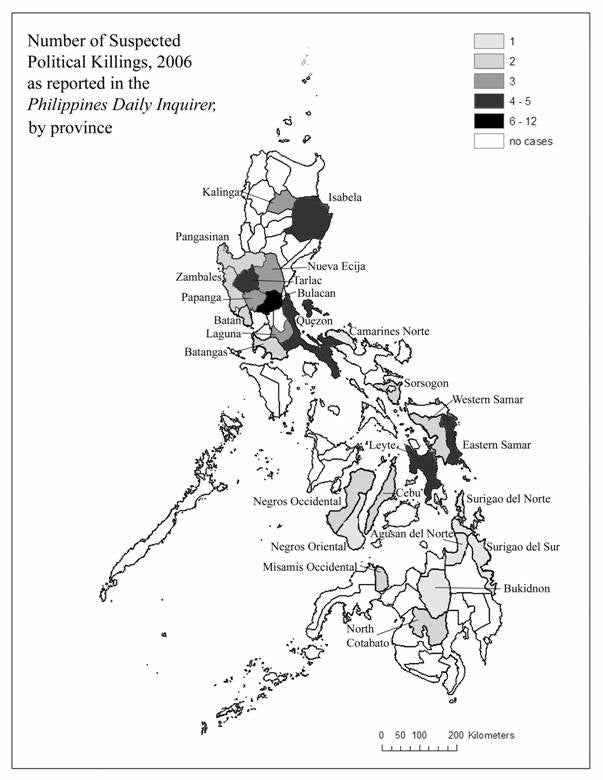In the Philippines such killings by the security forces or by the NPA are colloquially referred to as political killings, and they are occurring throughout the archipelago (see Figure 1). These include instances, including disappearances, 47 in which individuals are abducted and never heard from again, never released, and a body is never located, leading to people being considered disappeared.