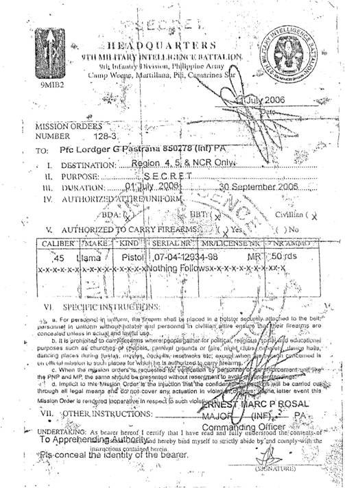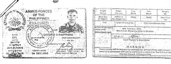 Figure 2: A military identification card in the name of Lordger Pastrana, found on the body of one of the assailants who dragged Father Isias de Leon Santa Rosa from his home. From the police file of investigation of the killing of Isias de Leon Santa Rosa, Daraga Municipal Police. © 2006 Bede Sheppard