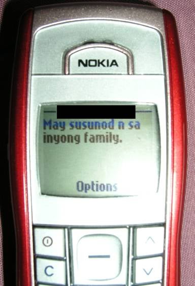 In only one of the incidents investigated by Human Rights Watch had a suspect even been arrested by the police. Harassment of families and acquaintances following killingsFollowing a killing, surviving family members or close acquaintances of victims reported to Human Rights Watch of harassment or intimidation from anonymous sources, some of which they perceived as death threats. The oldest daughter of Sotero Llamas showed Human Rights Watch a text message received on her mobile phone reading Another person in your family will be next (see Figure 5). She explained: