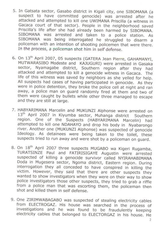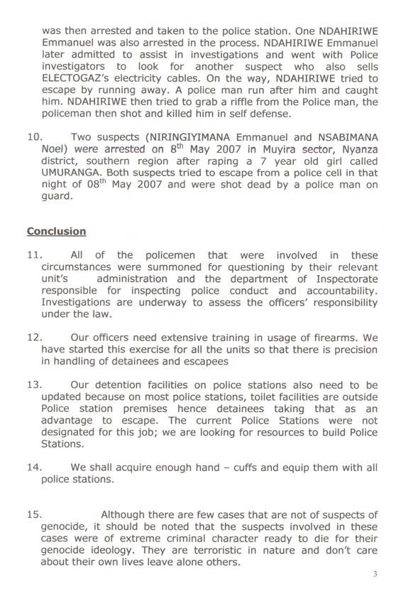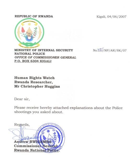 Annex One - Statement sent by Commissioner General of Rwanda National Police Andrew Rwigamba to Human Rights Watch researcher Christopher Huggins,