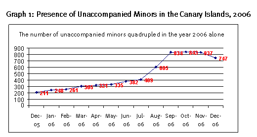 The same report also gives the average number of unaccompanied children in the protection system for the past seven years. One hundred children were in the Canary Islands protection system in 2000. That figure gradually increased and reached its first peak with 256 children in 2003. It leveled to around 200 children for 2004 and 2005. For 2006, the number of unaccompanied children in the protection system reportedly rose from a low of just under 250 in January to a high of almost 850 in October.[31]