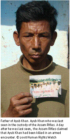 On August 30, 2007, the Litan police contacted the family. They said that the Assam Rifles had informed the police that a person had been killed in an armed encounter. They suggested that the family check to see if the unidentified person was their missing relative. The family identified the person as Ayub Khan. The Assam Rifles issued a statement claiming that a suspected militant had been shot in an armed exchange and weapons had been recovered from him. Ayub Khans father, Mohammad Karimuddin, told Human Rights Watch that the Assam Rifles are lying:
