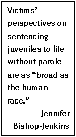 The five people Human Rights Watch interviewed all had experienced terrible crimes and the resulting pain and loss. Jennifer Bishop-Jenkinss pregnant sister and her sisters husband were murdered by a 16-year-old. Maggie Elveys husband was beaten to death at his store by a 15- and a 16-year-old. Azim Khamisas son, a 20-year-old college student, was delivering pizzas when a 14-year-old shot him. Bill Pelkes grandmother was stabbed to death by a 15-year-old who broke into her home and robbed her. Melanie Washingtons son was killed in a drunken rage by his 17-year-old friend. While each crime was devastating to family members, each person interviewed arrived at very different positions on whether it is right to give a sentence with no possibility of parole to a juvenile.164 These five people cannot represent the full spectrum of victim opinions, nor is such a small sample representative. Most people we spoke with would probably agree with Bill Pelkes statement, The penalty can never be enough for a murder, thats just a fact. Regardless of what we do to the person who committed the crime, we arent going to bring back the person who was killed.165