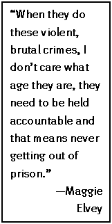 Elsewhere on the spectrum are victims for whom the age, the possibility of change, or other factors about the defendant are not relevant to the sentence. Their focus is the crime itself. When they do these violent, brutal crimes, I dont care what age they are, they need to be held accountable and that means never getting out of prison, said Maggie Elvey.169 Society seems to think now that it is OK to kill someone and the killer should expect to get out of prison and walk the face of the earth again. The victims family cant expect their murdered loved one to walk on the face of the earth again. Years ago we learned that if you take a life, you lose yours. But now, there are no morals, no respect for life, and no accountability for bad choices.