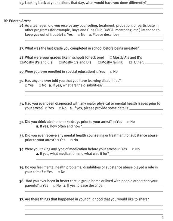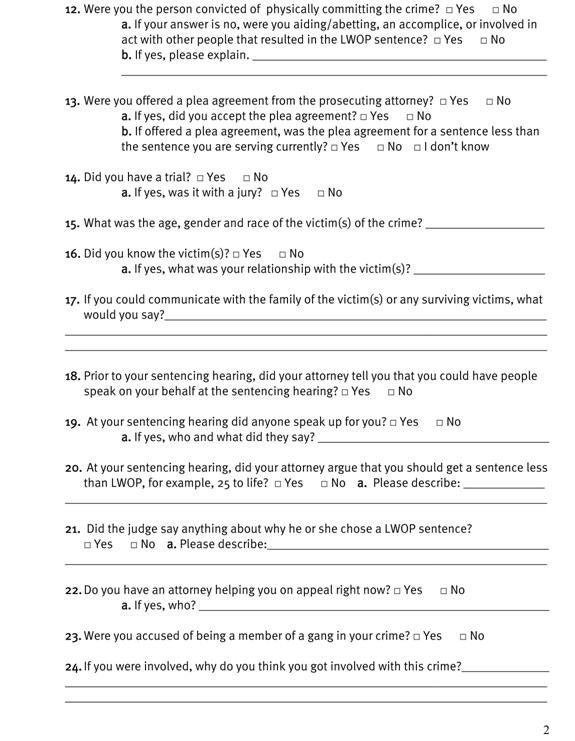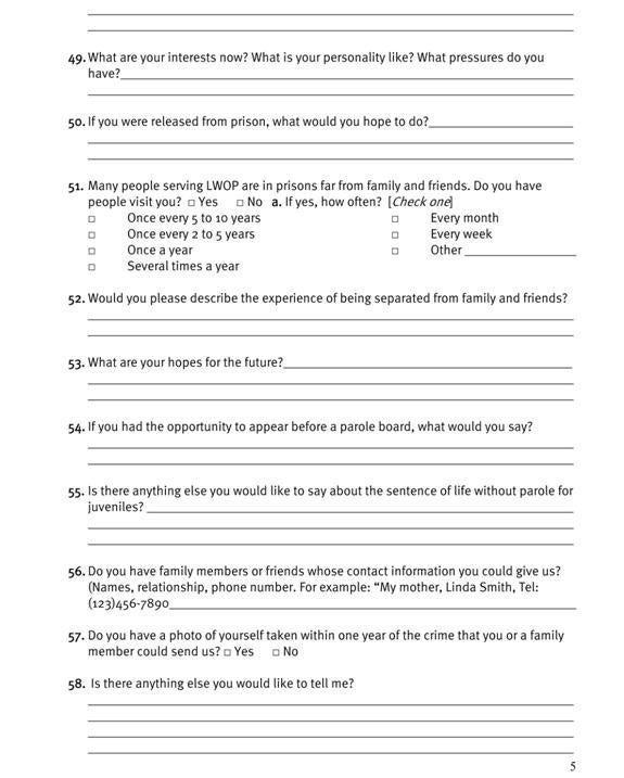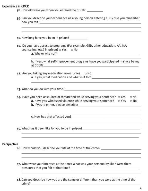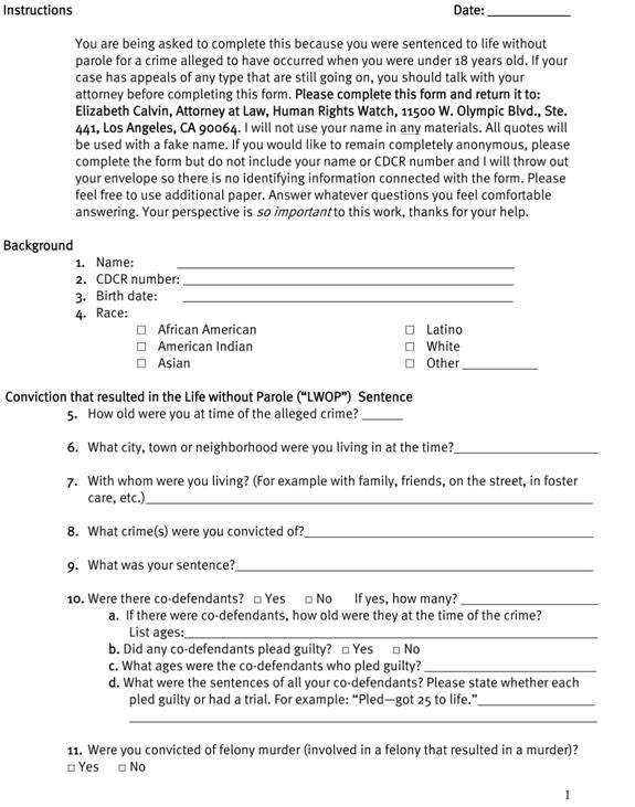 In July 2007, Human Rights Watch sent a five-page survey to all people on the CDCR’s list. A copy of the survey is included here in Appendix A. The survey permitted short narrative answers, and some respondents included addendums with lengthy answers. The cover letter explained the survey’s purpose and informed recipients that their real name would not be used in published materials and that there would be no personal gain from the information provided. One hundred twenty-seven people responded to the survey, representing more than 50 percent of the known population. The survey is five pages long and asks questions in five sectors, including personal background, information about the case, their experience of trial and sentencing, conditions in prison, and their feelings. Several sample responses are included in Appendix B.