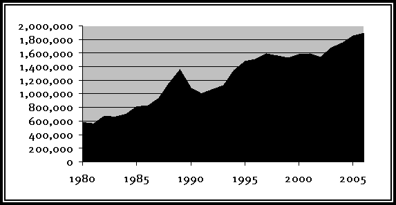 III. Background: The War on Drugs and the US Criminal Justice SystemSince the early 1980s, when the Reagan administration launched the war on drugs, federal and state measures to battle the use and sale of drugs have emphasized arrest and incarceration rather than prevention and treatment.15 The impact on the criminal justice system has been dramatic. Between 1980 and 2006, arrests for drug offenses more than tripled, rising from 581,000 arrests in 1980 to 1,889,810 in 2006.16 Fig.1: Drug Abuse Violation Arrests