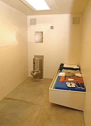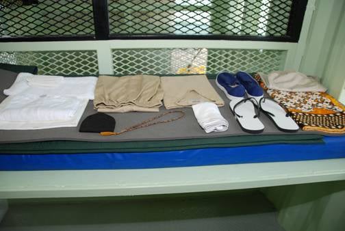 Cell inside Camp 5. © 2006 Reuters Lights are kept on 24 hours a day, and detainees are constantly monitored by guards who peer in through the windows of the floor-length steel cell doors.9 Detainees are given eye masks so that they can sleep in spite of the lights.10