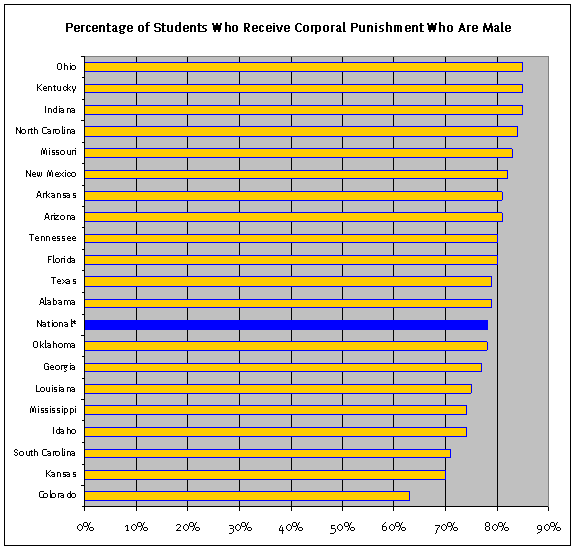 VIII. The Use of Corporal Punishment against Specific GroupsCorporal punishment is used disproportionately against certain groups of students, including boys, African-American students, and special education students. For instance, African-American students make up 17.1 percent of the nationwide student population, but 35.6 percent of those paddled.316 Even while overall corporal punishment rates have declined during the last 30 years, disparate rates of physical punishment of African-American students have persisted.317 Some might argue that this discrepancy exists because there is a higher percentage of African-American students in states that paddle heavily, and so they are overrepresented in national statistics on corporal punishment. Yet when we examine data from only the 13 states that paddle more than 1,000 students per year,318 disproportionality of paddling of African-American students persists. Among those 13 states, African-American students are 1.4 times more likely to get paddled than might be expected given their proportion of the student body. Likewise, among those 13 states, Native American students make up 1.2 percent of the student body, but 2.4 percent of those paddled, a disproportionality of two to one.319 These disproportionalities impinge on students right to non-discrimination in access to education. In addition, they further undermine the learning environment of the school, and create a hostile environment in which minority groups may struggle to succeed. Boys Paddled More Than GirlsBoys are subjected to corporal punishment at much higher rates than girls: nationwide, boys make up 78.3 percent of those paddled, while girls make up 21.7 percent.320 Boys are paddled more than girls in all states that use corporal punishment. For instance, in Mississippi, 74.2 percent of those paddled in schools are boys, while in Texas, 78.7 percent of those paddled are boys.321 One high school teacher suggested one possible reason for the gender disparity in paddling, noting that at her school it was common practice to stay away from hitting the girls. I guess theyre more fragile, and a lot of them could be pregnant and we wouldnt know it.322 A father of two boys and a girl felt that it was more acceptable for boys to be paddled than girls. He explained, My little girldont you put your hands on her . As far as my boys, I am super hard on them. For one, they are young black men and they are faced with different obstacles in life. I get on them every day, and I know they say, Man, my dad is tough.323 Many interviewees reported that boys were beaten more harshly than girls. A middle school boy in Mississippi observed that one of his teachers paddle the boys real hard and when he paddle the girls he dont really hit them.324 One student reported that there are smaller paddles for girls: They use a short one for girls and a long one for the boys.325 One middle school student, however, told us that [s]ome girls that act fast like theyre gay or something theyll get hit real hard. When they be trying to feel other girls.326 Figure 2