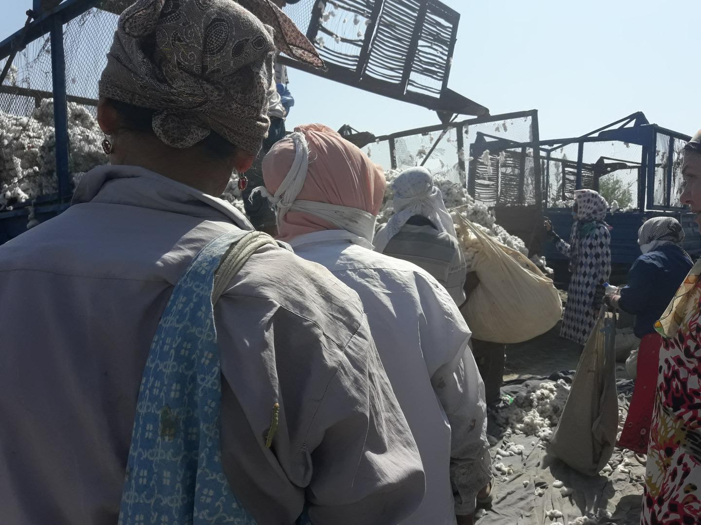 Работники грузят собранный ими хлопок на грузовики, уборка урожая 2016 года.
