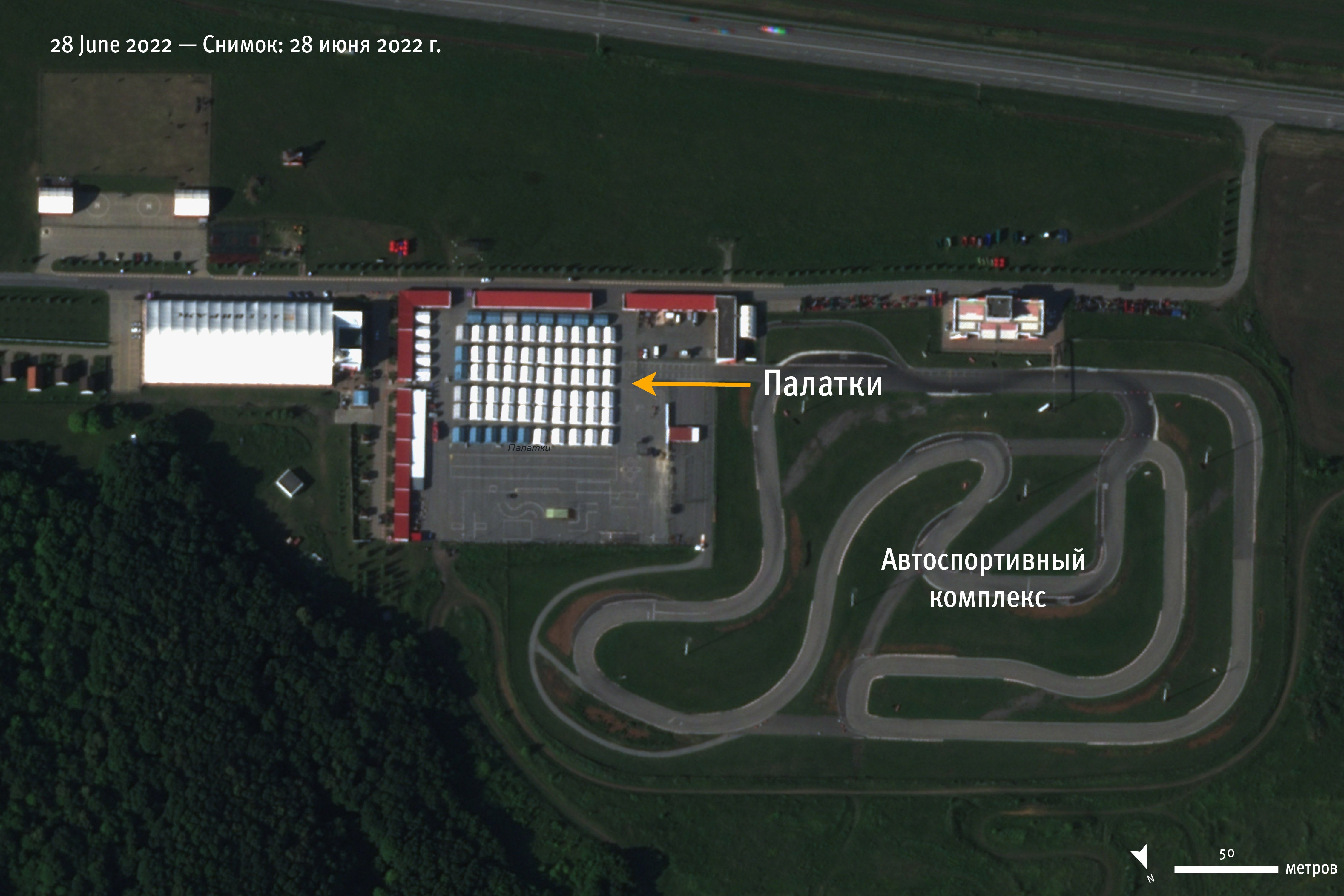 На спутниковом снимке от 28 июня можно увидеть, что в центральной части парковки АСК «Вираж» стоят как минимум 68 палаток и еще пять палаток стоят сбоку.