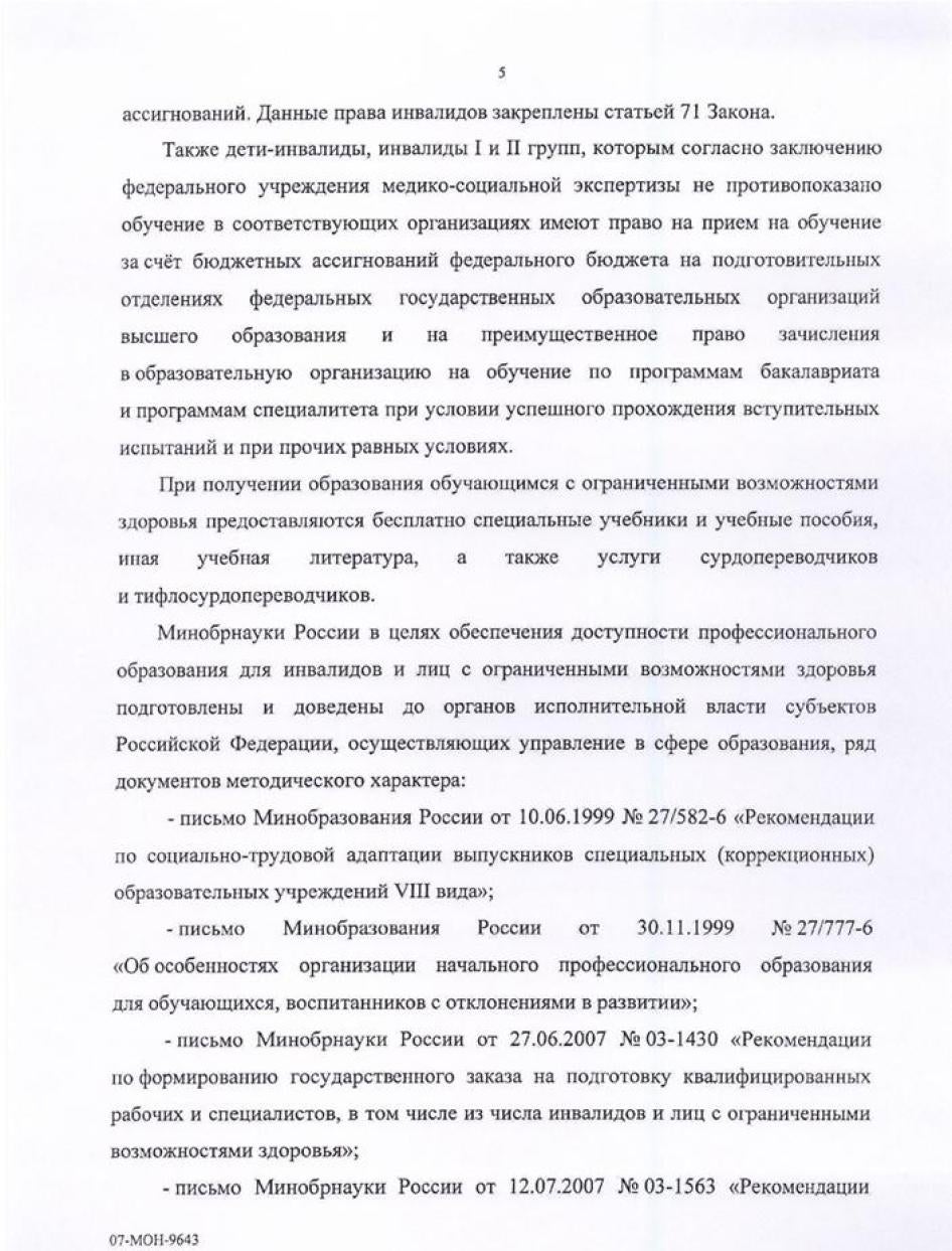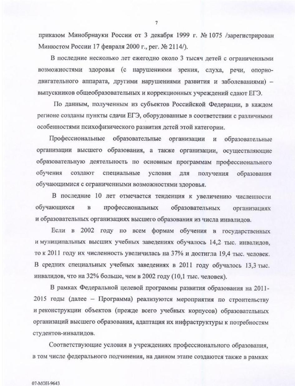 Хьюман Райтс Вотч направляла министерствам образования, культуры, здравоохранения, регионального развития, труда и социальной защиты, связи и транспорта письма с вопросами, изложением выводов доклада и предложением представить их видение ситуации, с тем, чтобы мы могли отразить его в докладе. Ответы были получены от Минкомсвязи (упоминается в тексте доклада), а также от Министерства образования и Министерства труда и социальной защиты. К сожалению, последние два поступили слишком близко к дате публикации, поэтому в самом докладе отражения не получили. Они приводятся в Приложении.