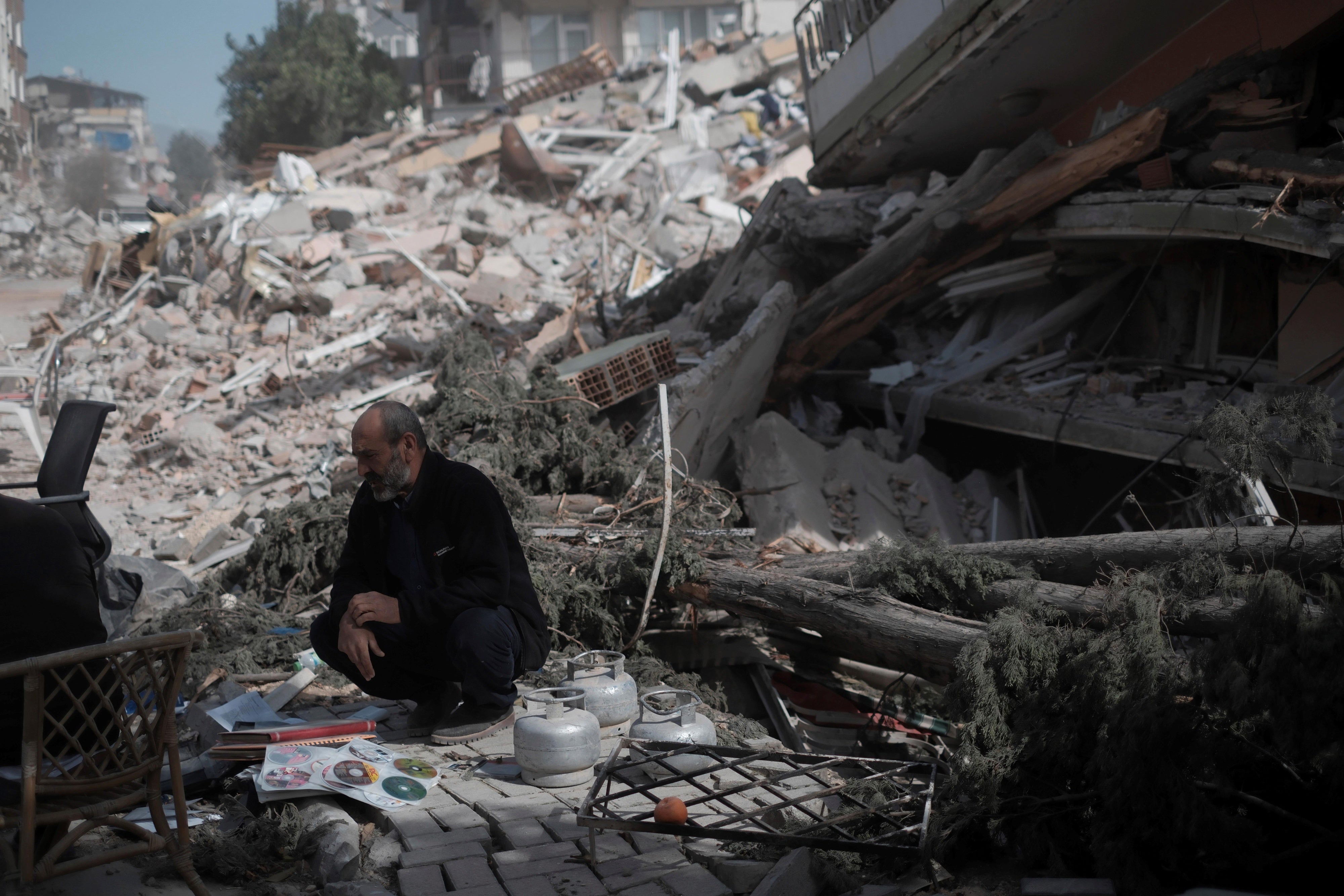 50.000'den fazla insanın öldüğü, yüz binlerce kişinin yaralandığı ve yerinden edildiği yıkıcı depremlerden bir ay sonra, 6 Mart 2023'te Türkiye'nin güneyinde yer alan Antakya'da bir binanın enkazının yanında bir kişi.