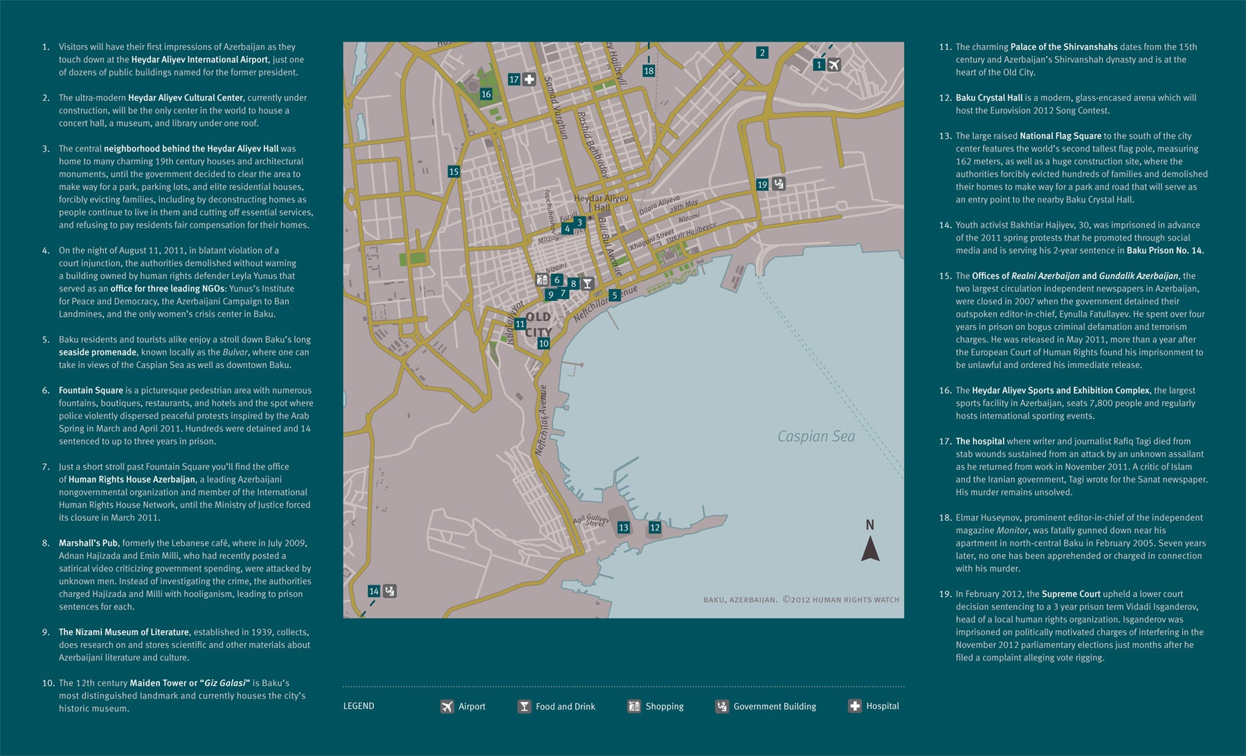 In one Baku neighborhood, hundreds of families were forcibly evicted to make way for a highway and a park serving as a grand entryway to a newly built, glass-encased arena, the Baku Crystal Hall. Some residents were forced out without warning, at times in the middle of the night. Homes have been torn down while the owners’ possessions – furniture, clothing, photos – were still inside. The 2012 Eurovision Song Contest will be the first major event hosted in the arena.
