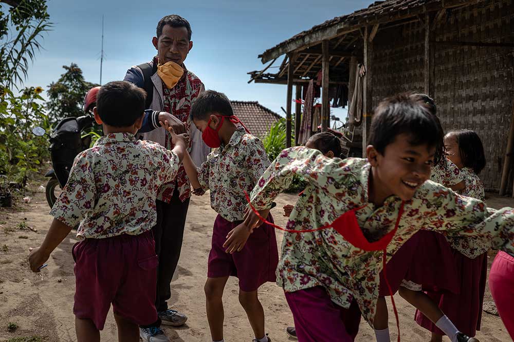 Students shake hands with their teacher Parmin (58), when he makes a home visit to students who have poor cellular service and cannot learn online at the remote area in Senden village, on the slope of Mount Merapi and Merbabu amid, in Central Java, Indonesia, in October 2020. © Ulet Ifansasti/Getty Images