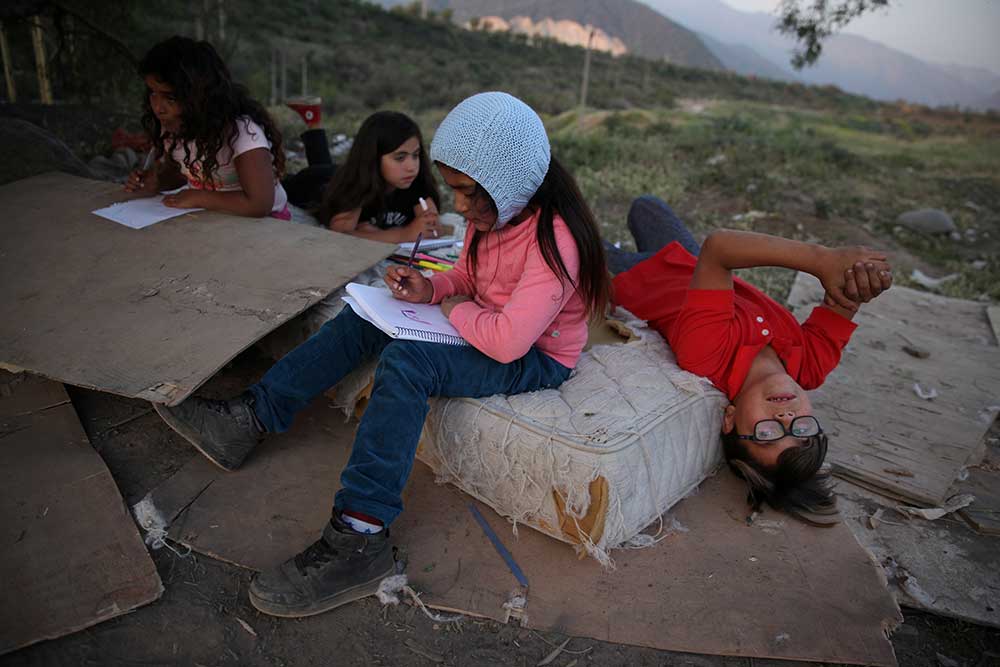 Danka, Danixa, Violeta, and Axel draw while sitting on a discarded mattress in October 2020, in the community "El sueño de todos" (Everybody's dream), an informal settlement without potable water, drainage system, and electricity, where people have moved with their families after losing their jobs and income during the Covid pandemic, on the outskirts of Santiago, in Puente Alto, Chile. © Ivan Alvarado/REUTERS