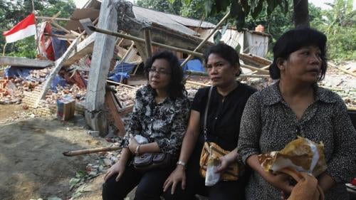 In the outskirts of Jakarta, Indonesia, members of the congregation of the Batak Christian Protestant Church sit near ruins of a church after an excavator demolished it, March 21, 2013.