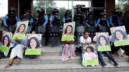 In March, Berta Cáceres, an indigenous land rights and environmental defender, was shot dead in her home. Although she had reported to police 33 threats on her life, none were investigated. Cáceres, a member of Honduras’ largest indigenous group, the Lenca, had waged a campaign to stop the building of the Agua Zarca Dam, which the activists condemn as a threat to the Gualcarque River. Five men, including an army major and the manager for social and environmental matters for Desarrollos Energéticos (DESA), the firm contracted to build the dam, were arrested in early May for alleged participation in Cáceres’s murder, which prosecutors said was part of a conspiracy with DESA. A sixth suspect was arrested in September.